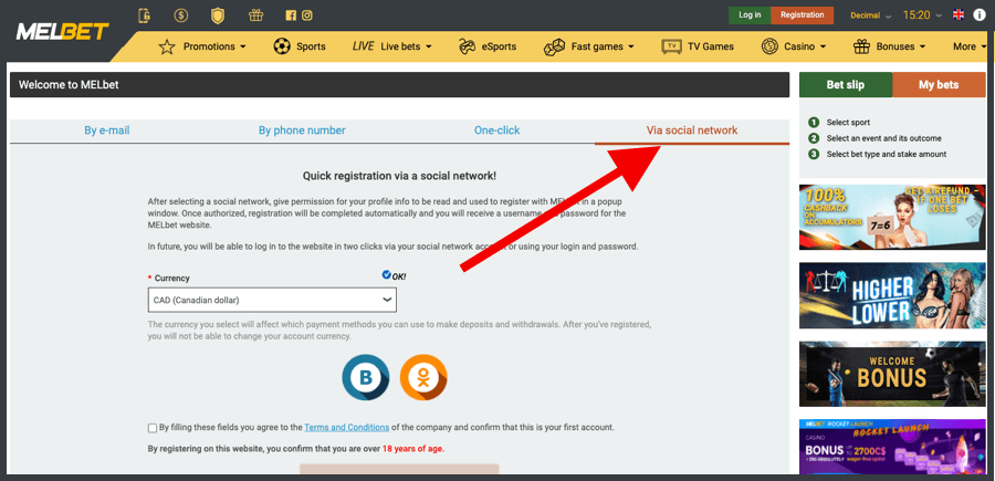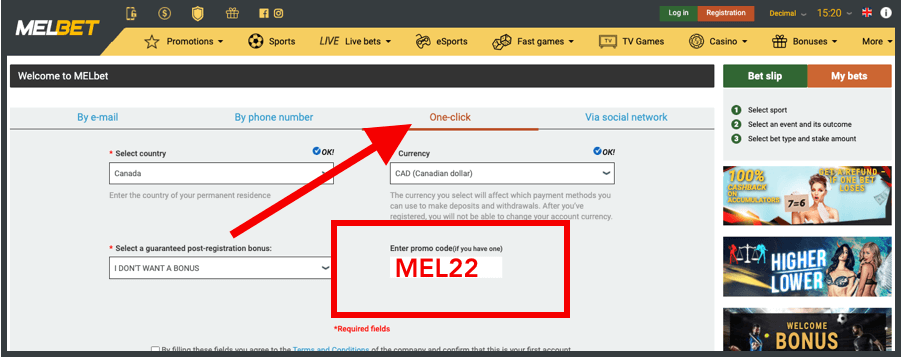 In one-click registration, you don’t need to fill out anything except your bonus code (MEL22) and confirm you agree to the rules.