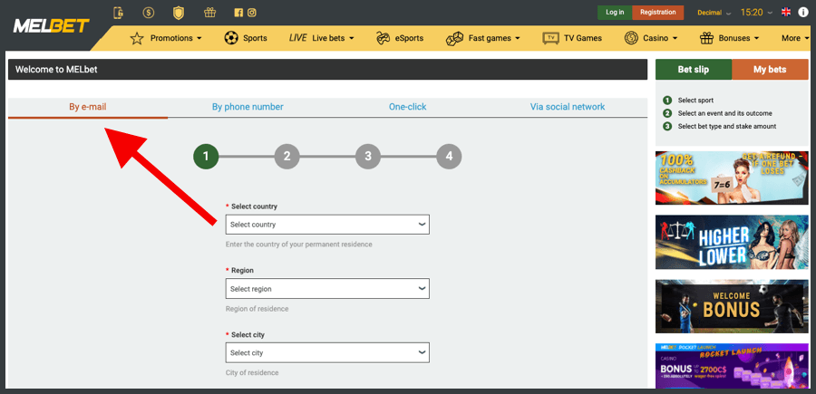 In step 3 you must choose a password, email and insert promo code MEL22 in the bonus field. Click to agree to the rules;