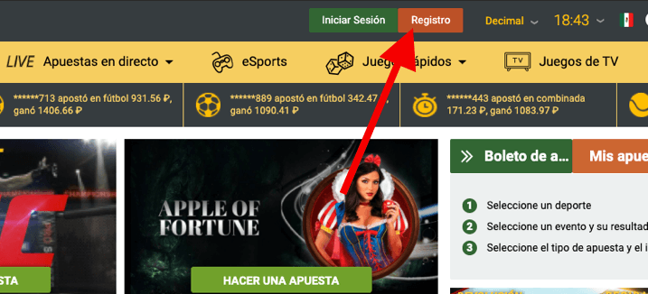 - Para registrarse en la versión de escritorio del sitio, es necesario hacer clic en el botón rojo “Registro” en la esquina superior derecha. Es lo mismo en la versión móvil del sitio.