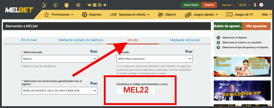 En el registro con un solo clic, no necesita rellenar nada excepto su código de bono (MEL22) y confirmar que acepta las reglas.