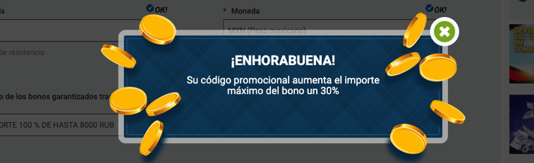 La bonificación estándar para todos los países en el primer depósito es del 100% del importe depositado hasta 100 euros. (O el equivalente a 100 dólares en cualquier moneda). Esto significa que si usted deposita cualquier cantidad hasta 100 euros, la misma cantidad de rublos de bonificación se acreditará a su cuenta adicionalmente.